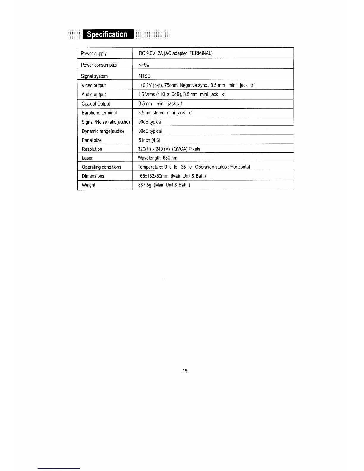 Coby TF-DVD5000 - Technical Specifications; Electrical and Signal Specifications; Physical Dimensions and Performance Specs