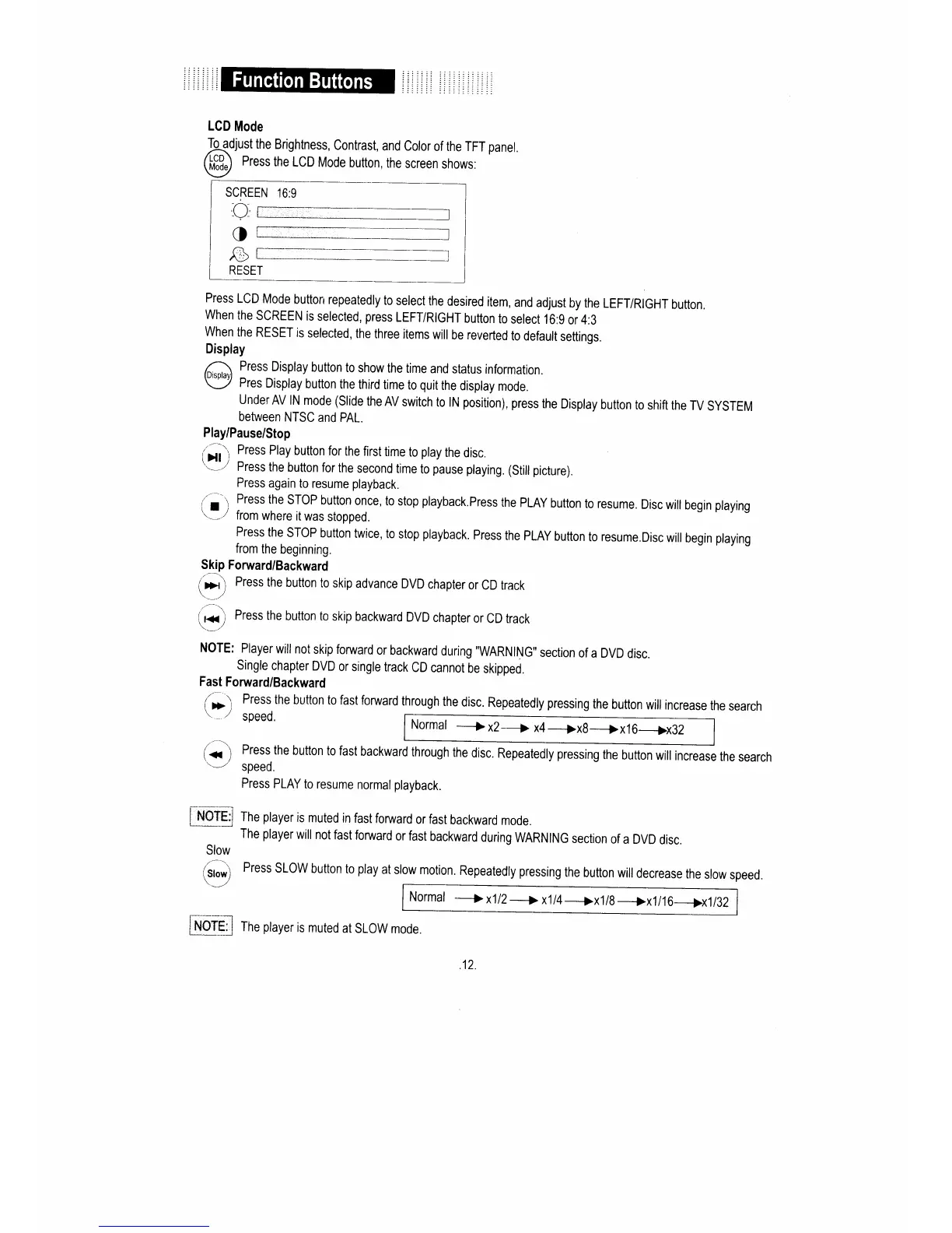 Coby TF-DVD7100 - Function Buttons; LCD Mode; Play;Pause;Stop
