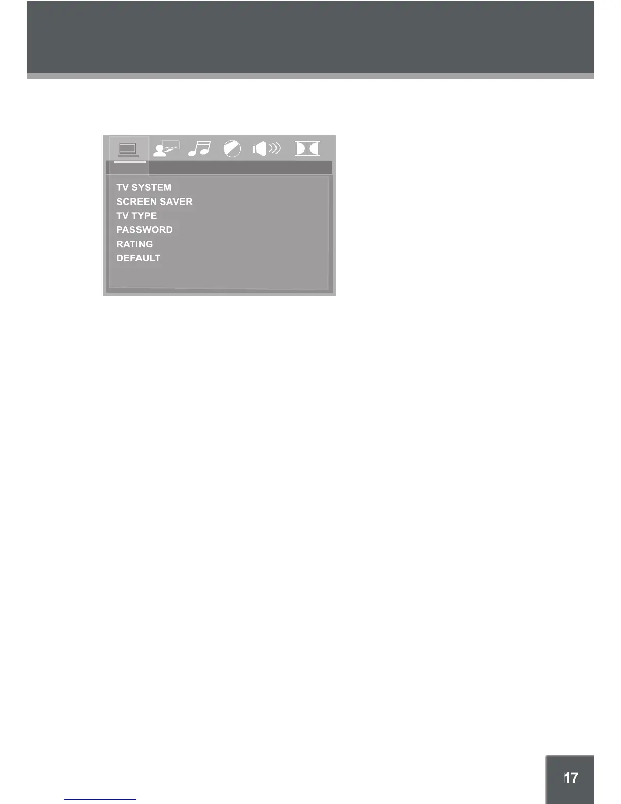 TV Type - Set the screen aspect ratio as 4:3 PS(Pan Scan), 4:3 LB(Letter Box) or 16:9(Wide Screen).
