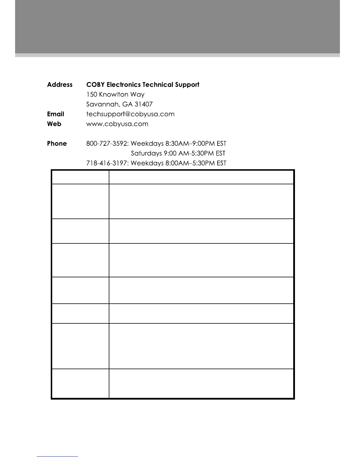 at www.cobyusa.com for Frequently Asked Questions (FAQs) and rmware updates. If these resources do