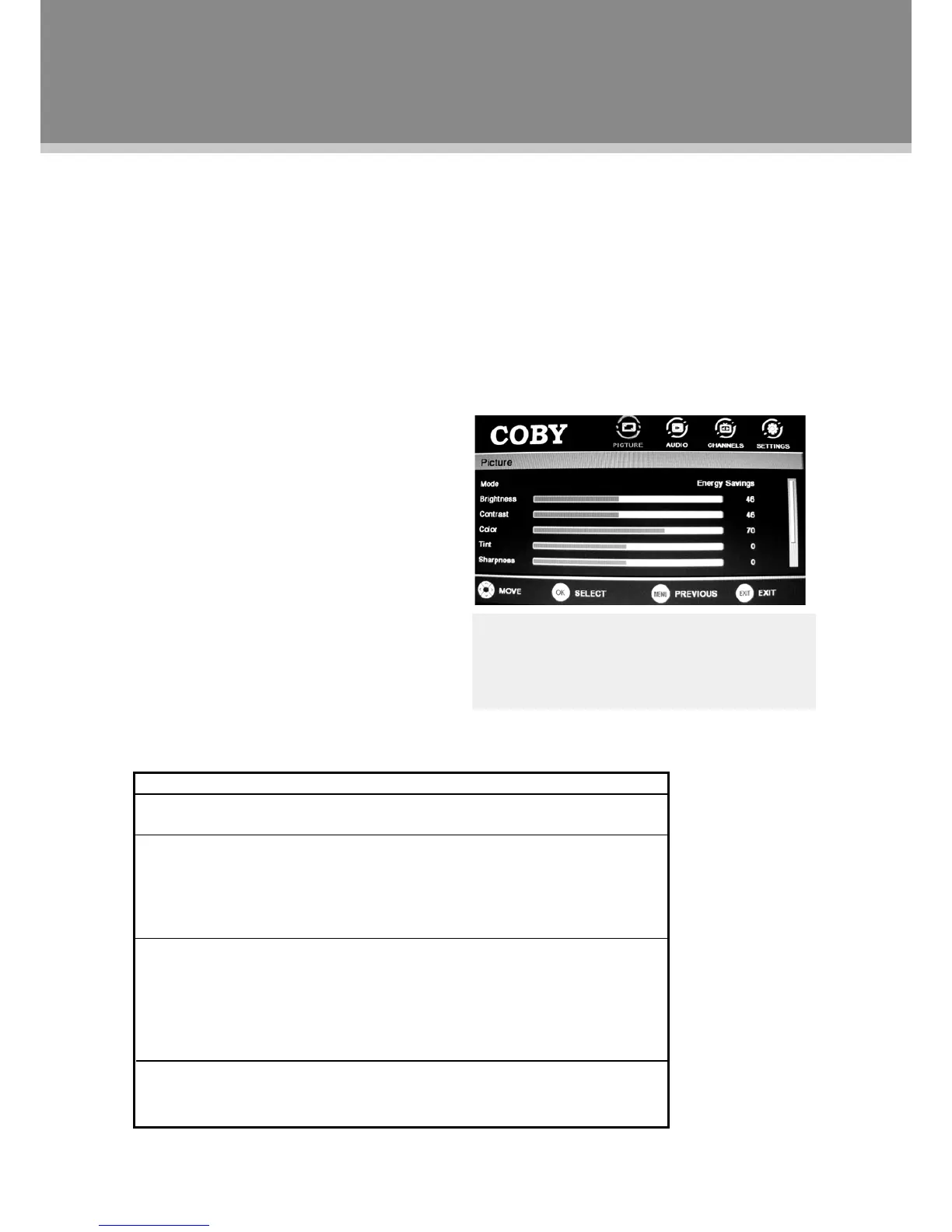 Mode - Setup the picture mode as Custom/Sports/Theater/Energy Savings/