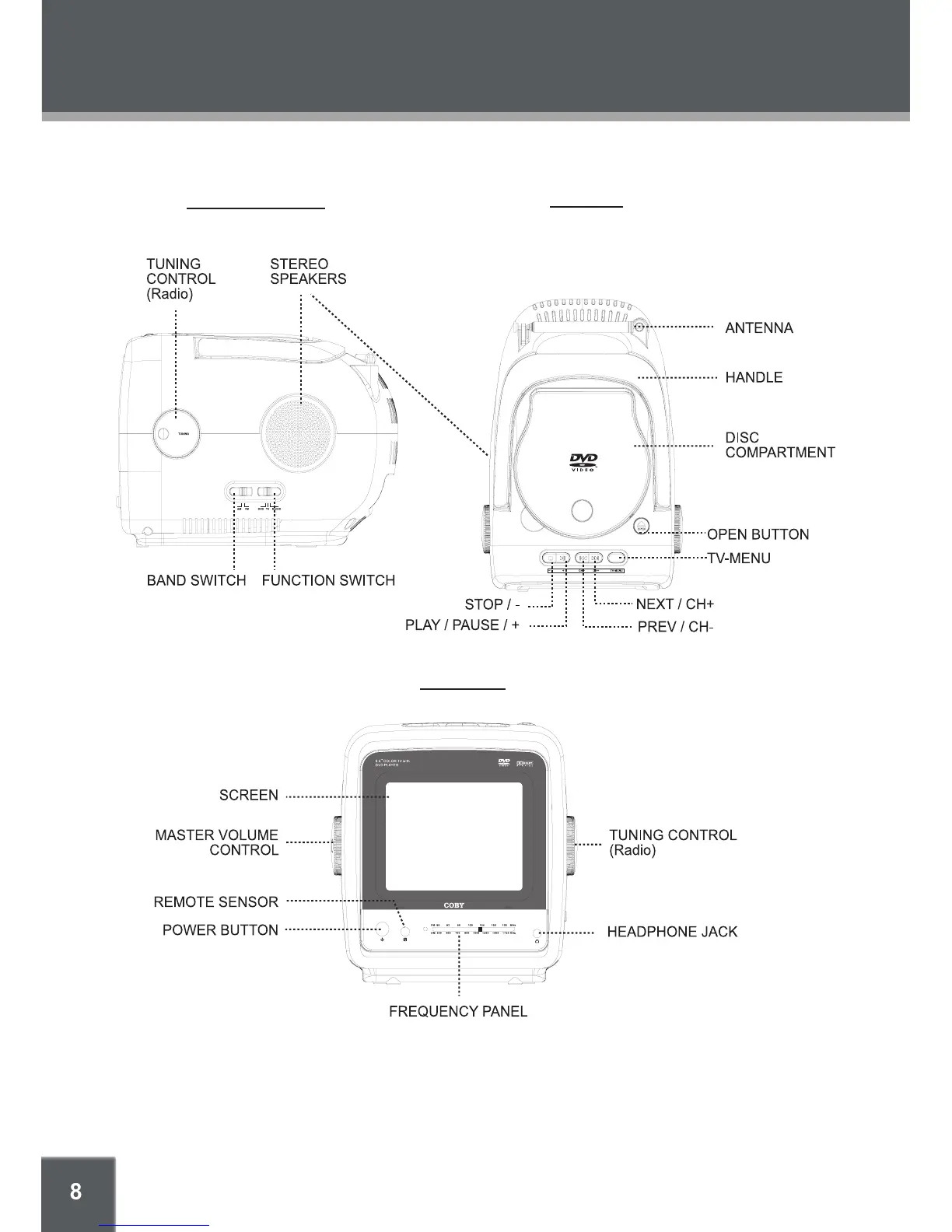 Coby TV-DVD1260 - Location of Controls; Side View (Right); Front View; Top View
