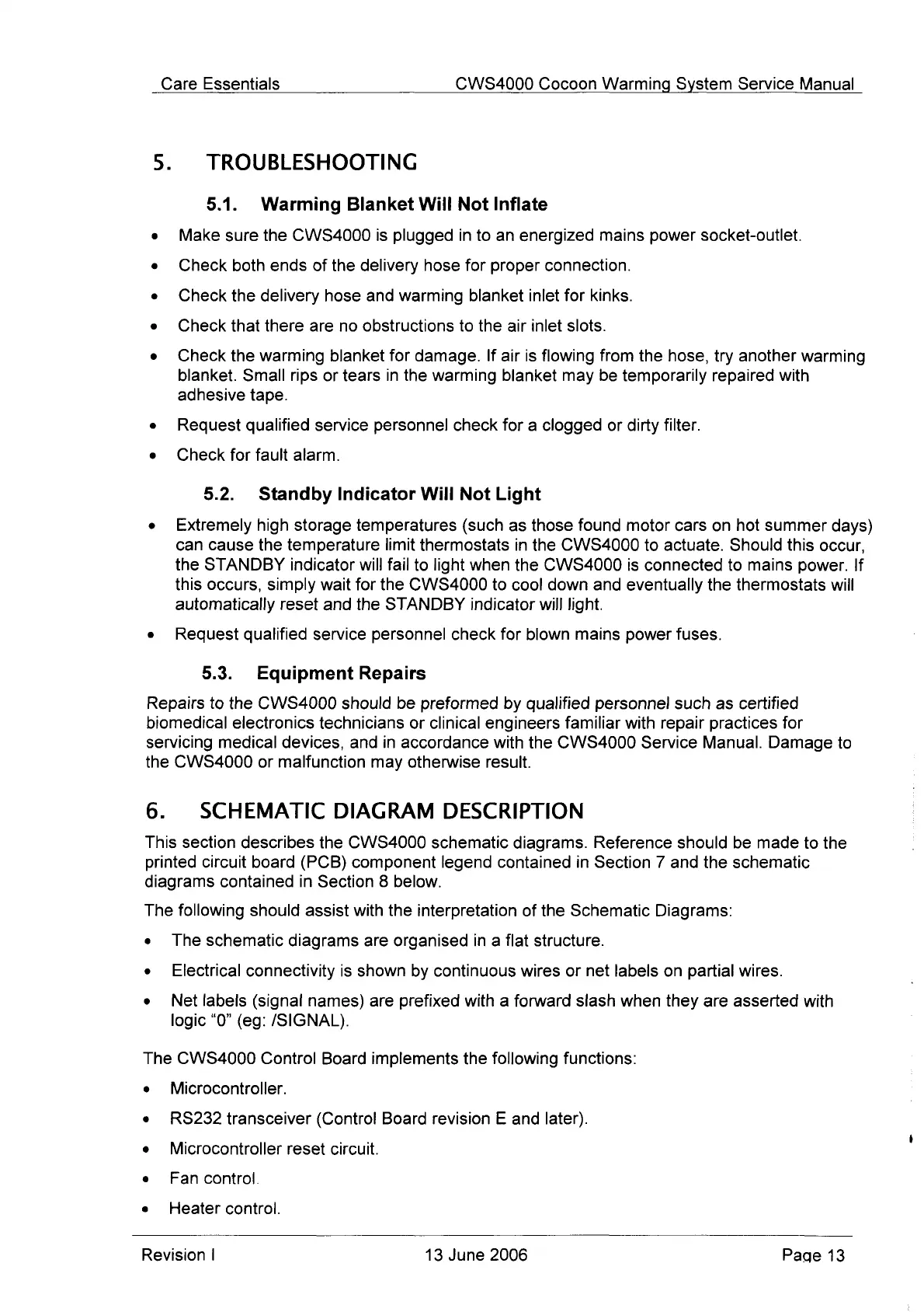 Cocoon CWS 4000 - Troubleshooting; Warming Blanket Will Not Inflate; Standby Indicator Will Not Light; Equipment Repairs