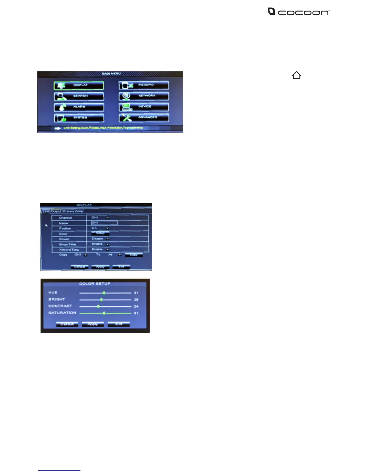 switch between Live, Output and Privacy Zone sub-menus. The Display menu provides access to