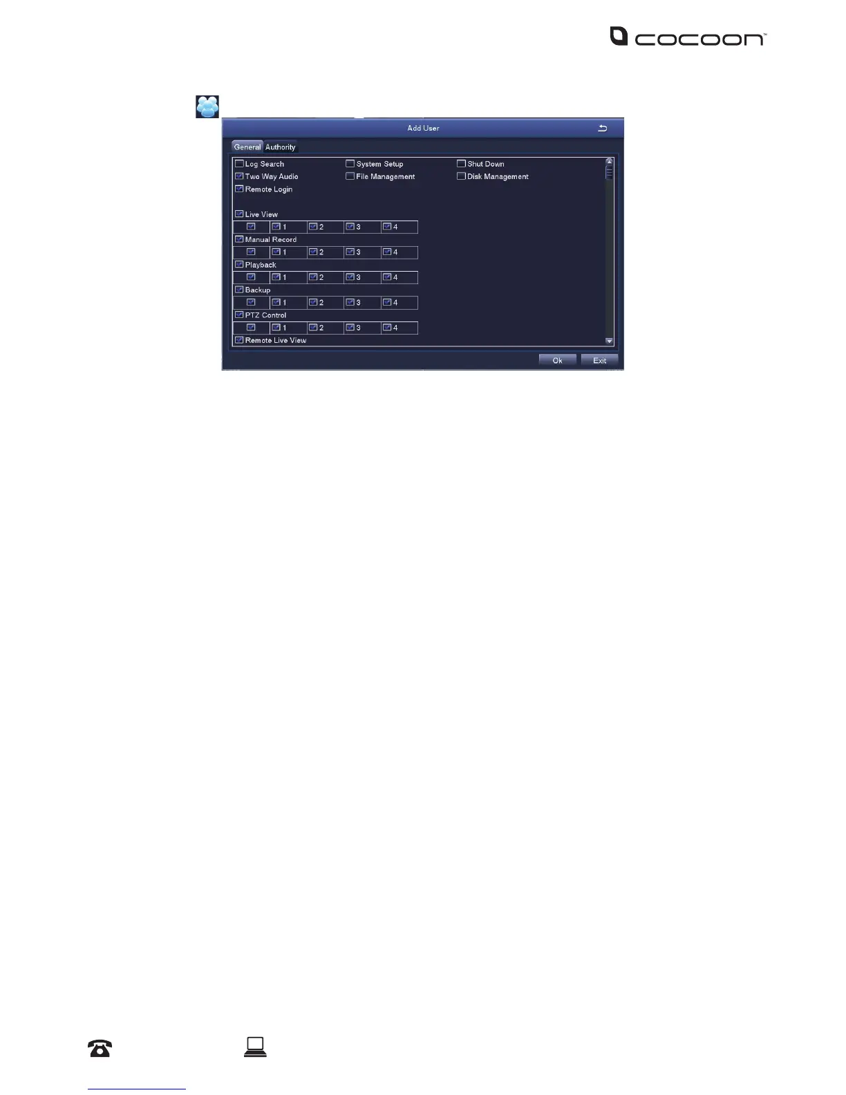 For more specic settings, such as being able to shutdown the DVR, select the ‘Authority’