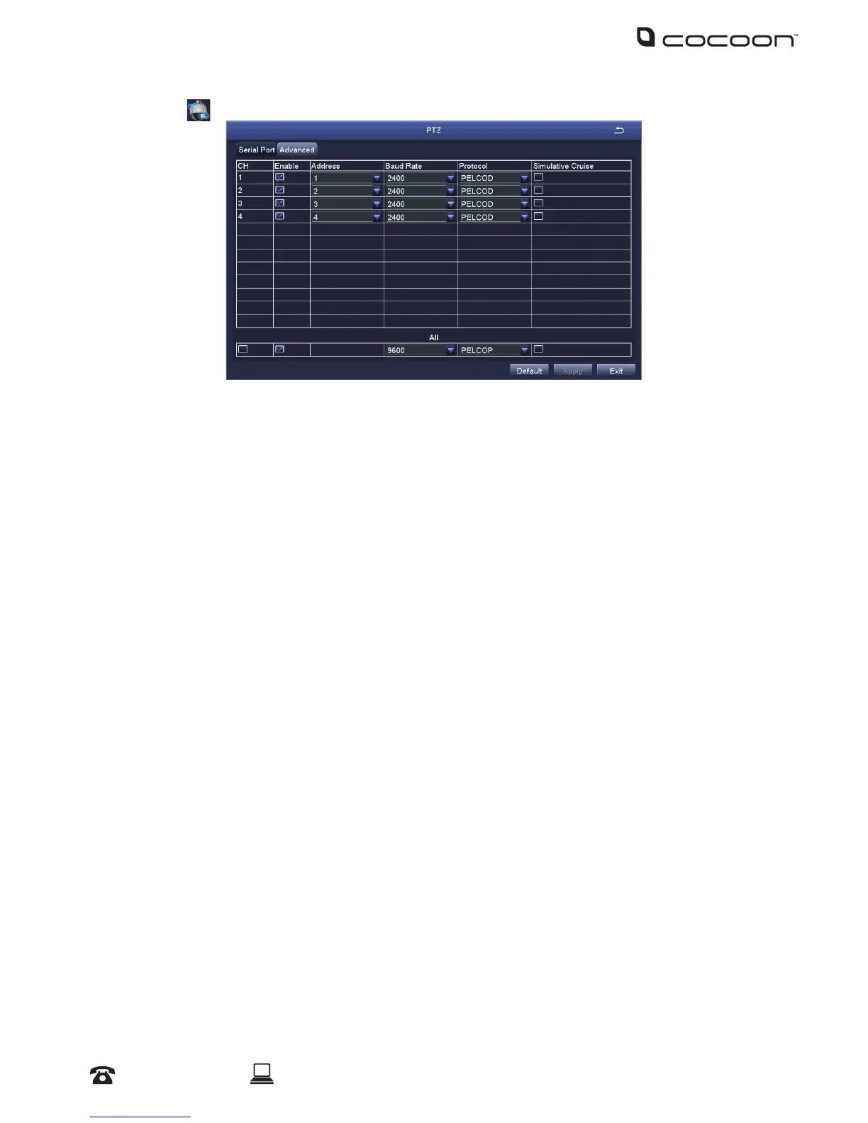channel in connection with the PTZ camera is selected. Consult the manual of your PTZ camera for
