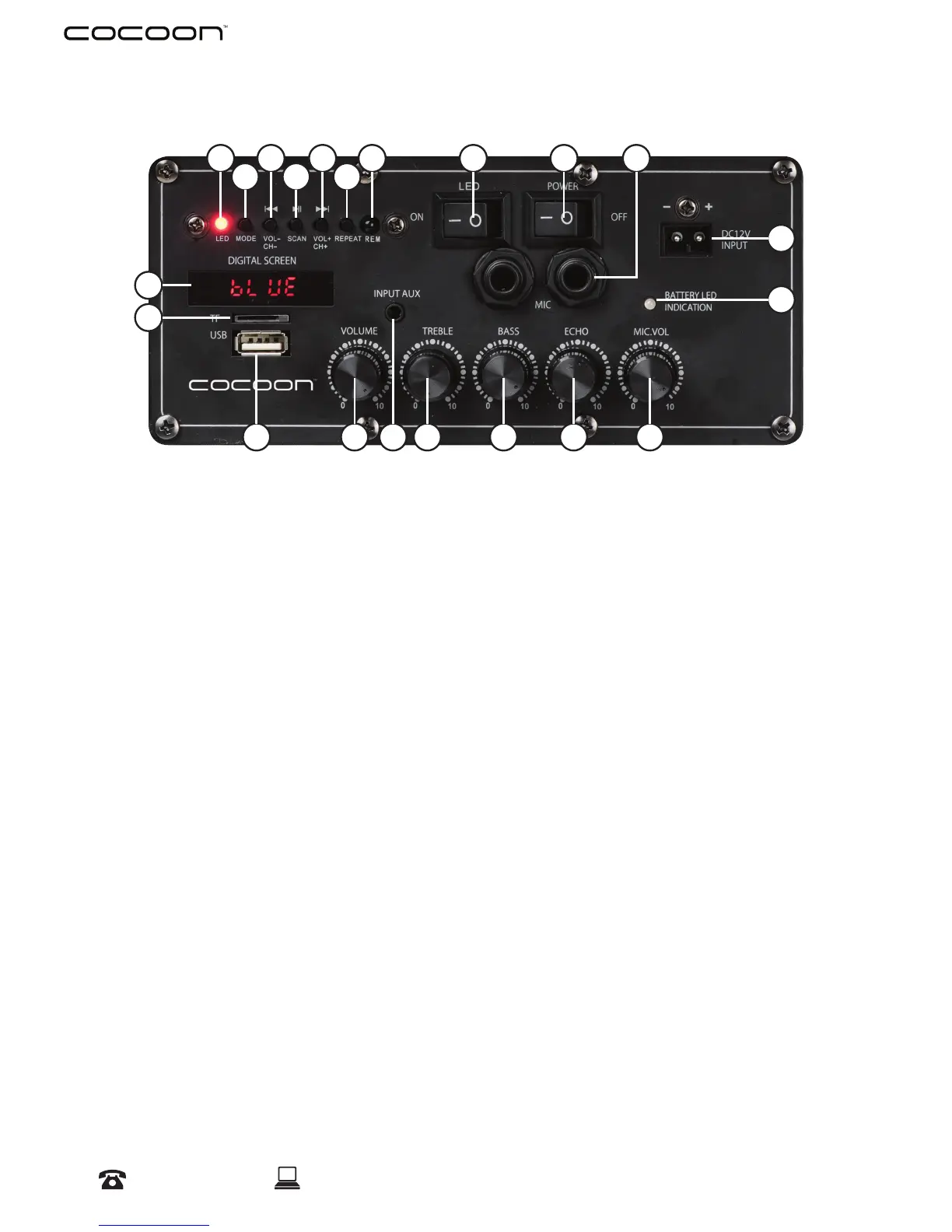 20. TF Port: Input a Micro SD Card (FAT32 Format) for MP3 playback