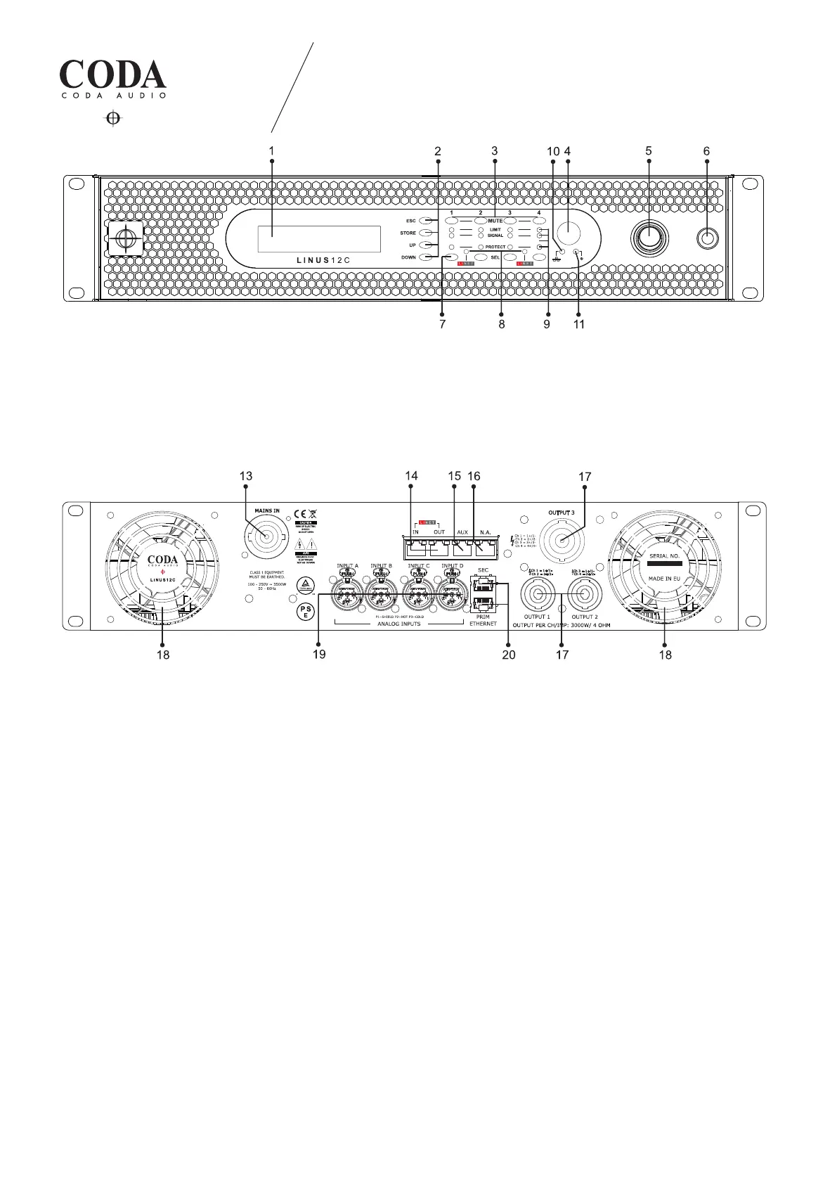 13 AC power connector (powerCON® 32 A) 17 SPEAKON® amplier output connectors: