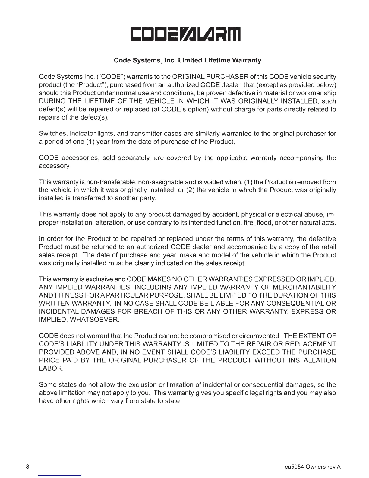 Product must be returned to an authorized CODE dealer and accompanied by a copy
