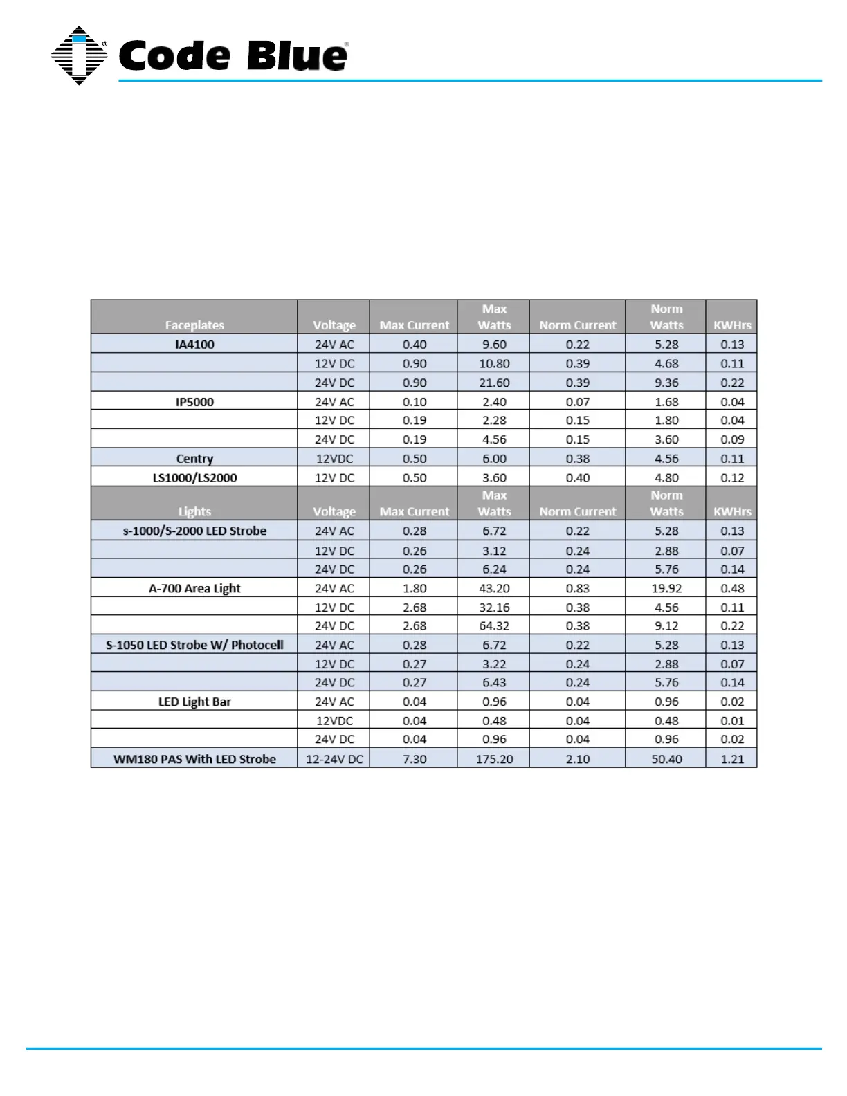 The following table includes IA4100 and ALL OTHER Code Blue Devices and Enclosures for