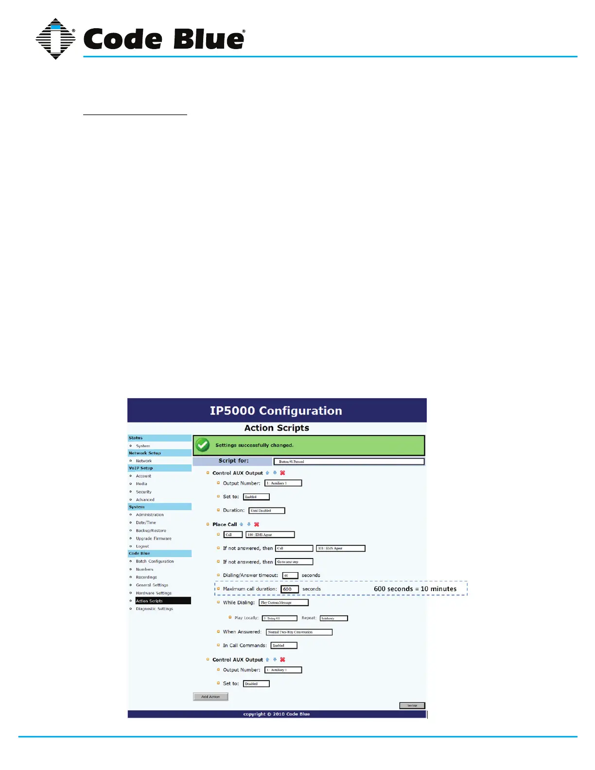 In this example, the Auxiliary Output 1 is on for the duration of the call.