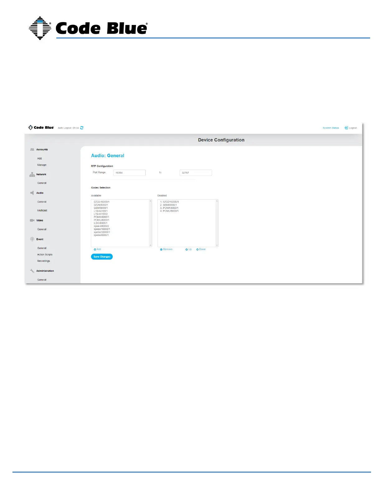 Code Blue LS1000 - LS1000 Audio Configuration; RTP Ports and Codec Selection
