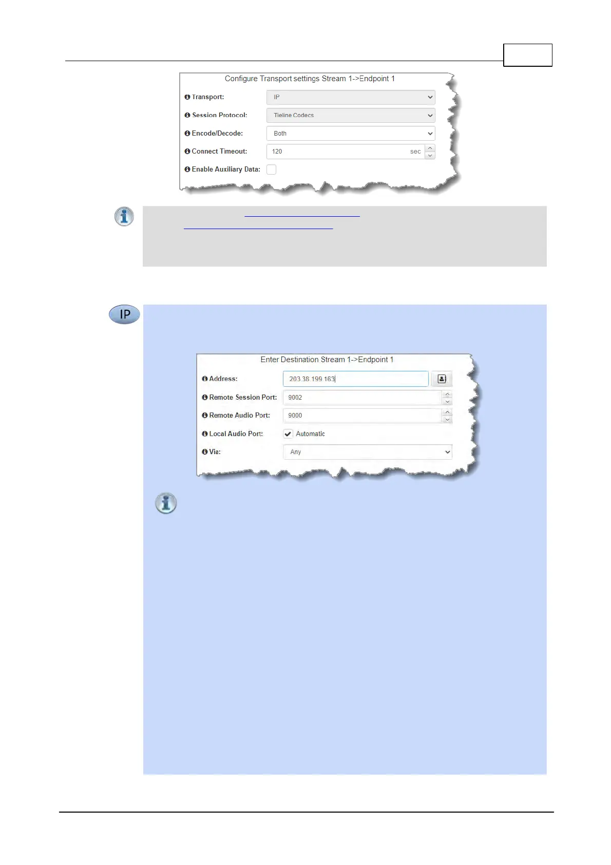 For IP connections configure the IP address, ports, and then specify which streaming