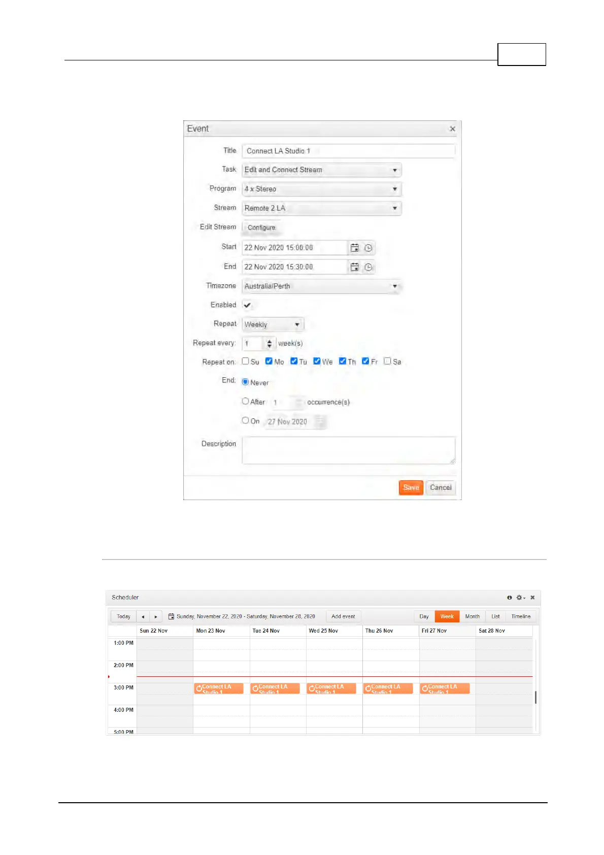 4. Click Save to add the new event to the Scheduler panel.