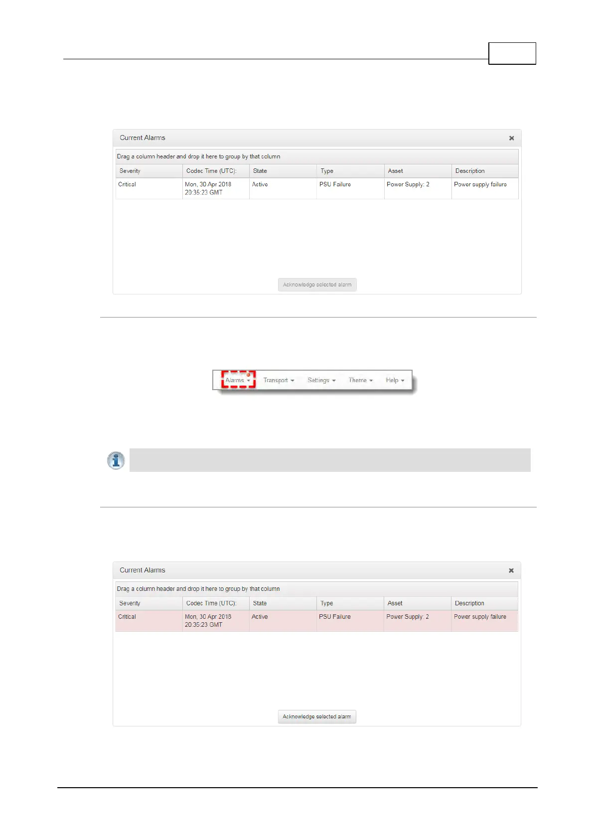 Open the HTML5 Toolbox Web-GUI and click Alarms, then click Current Alarms to view active
