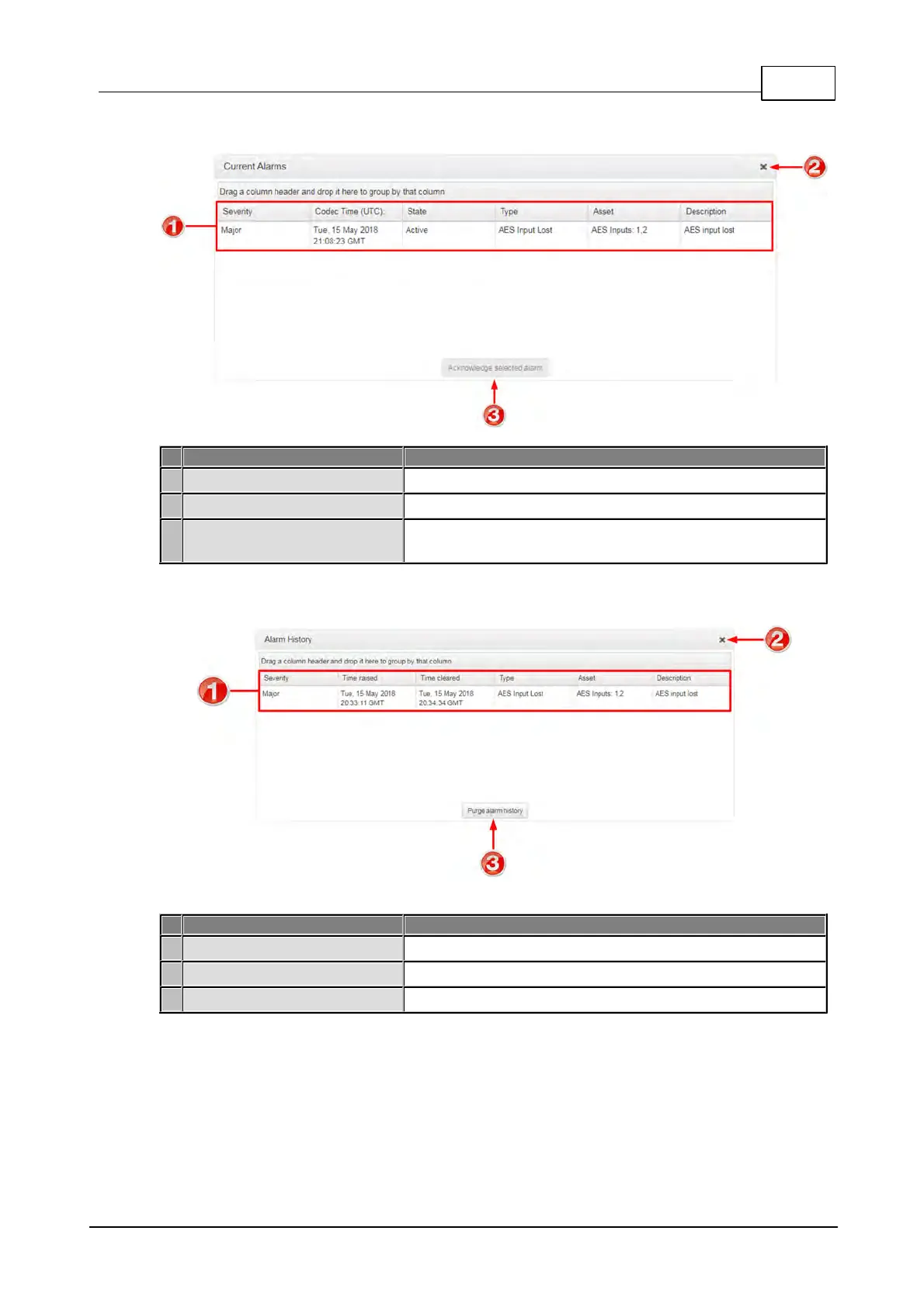 View a list of active alarms in the codec