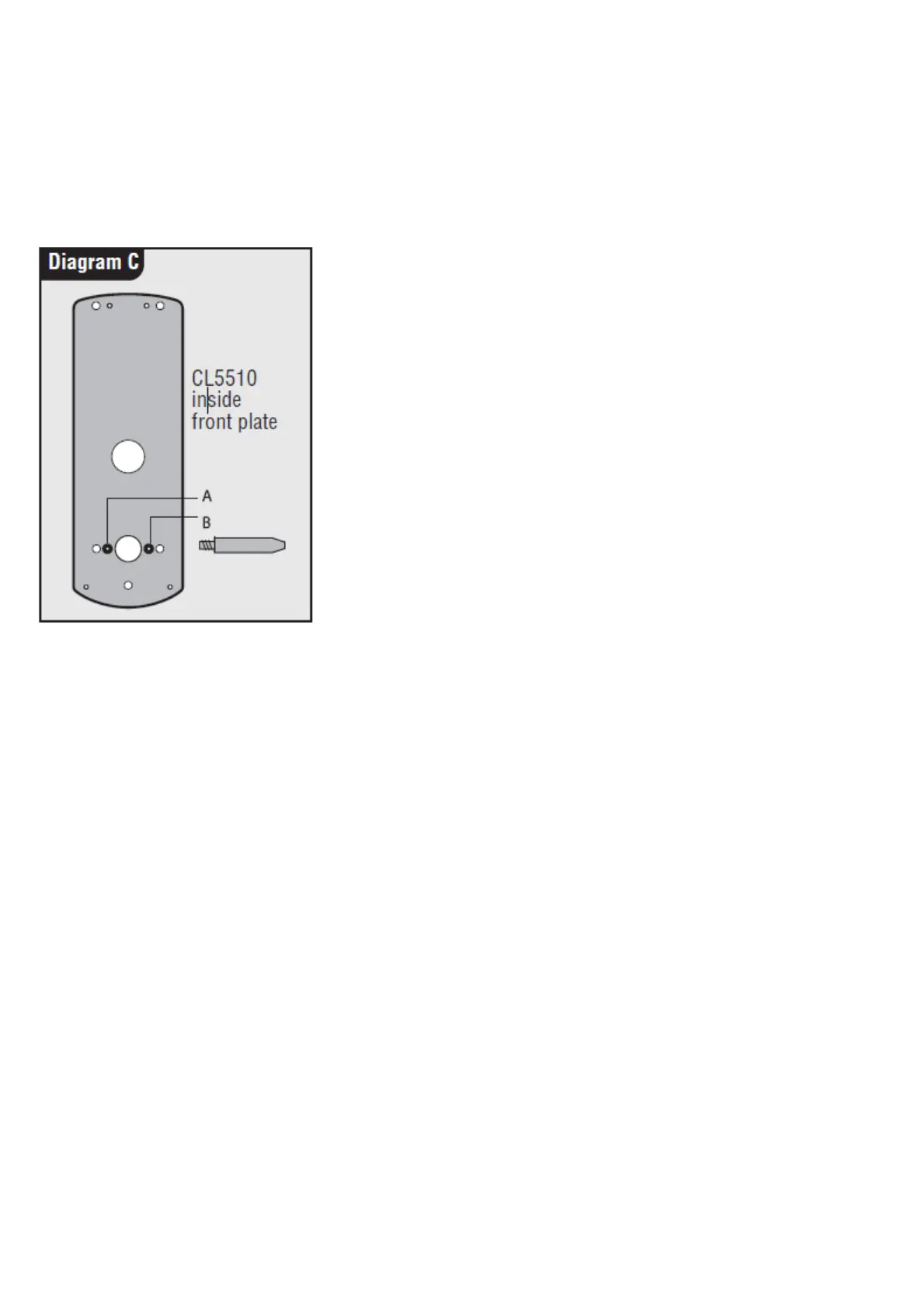 6. Fit the latch support post on the inside of the front plate, in hole A for a right hand hung door and hole B for a