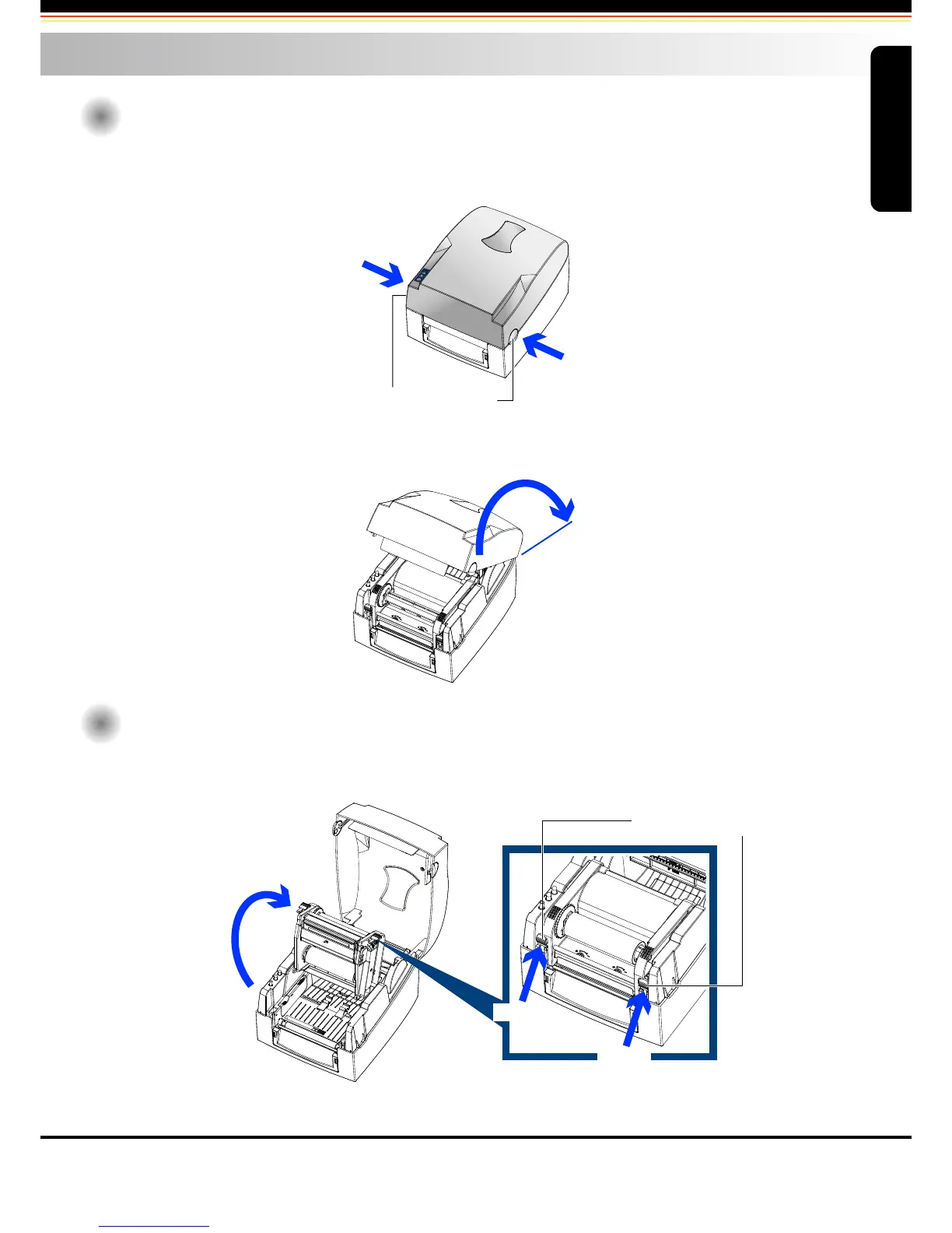 Place the printer on a flat surface. Open the printer cover by pressing the release buttons on both sides of the