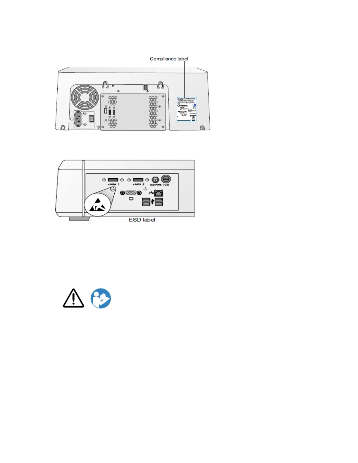 Location of ESD labels at rear of Controller (Display arm not attached)
