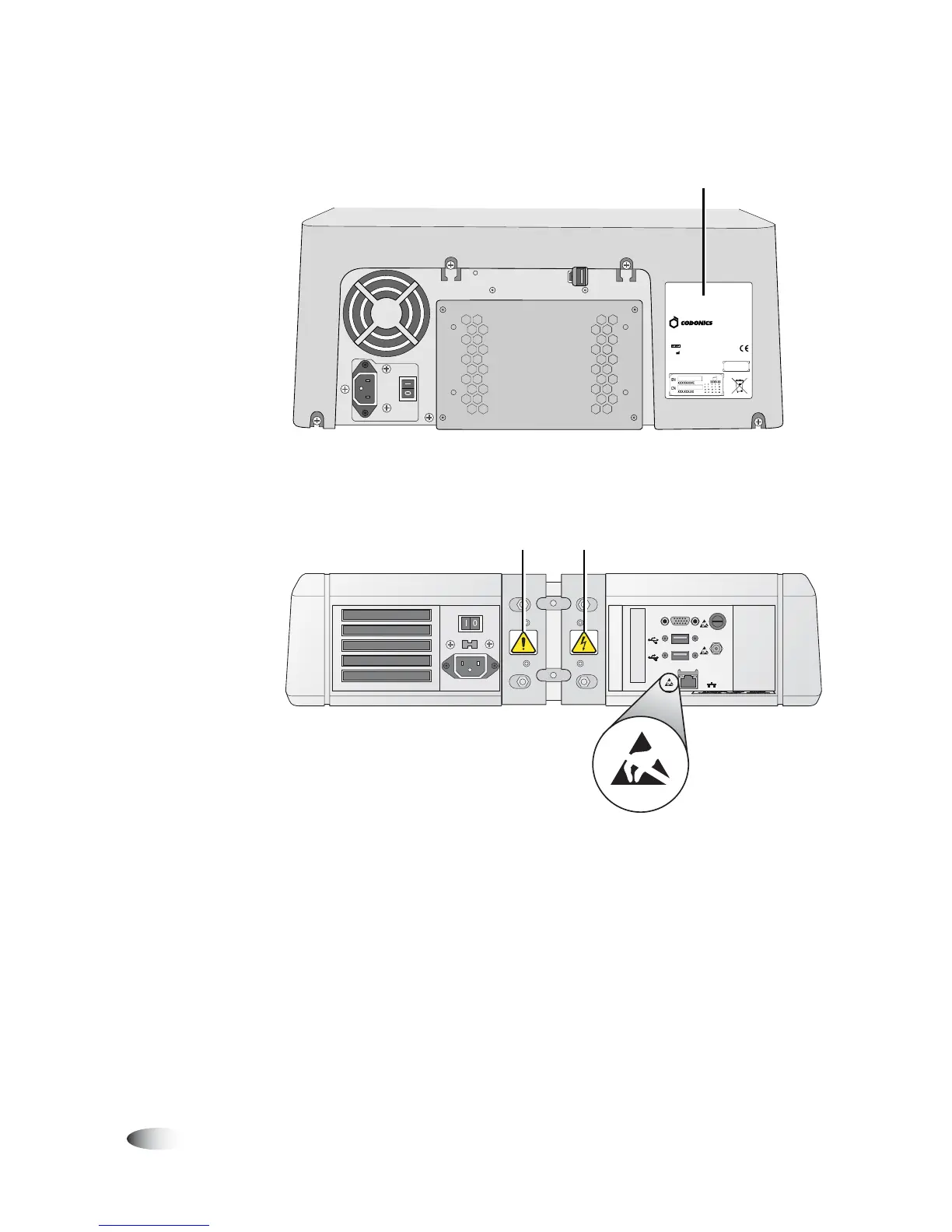 Location of ESD, shock, and caution safety labels at rear of Controller
