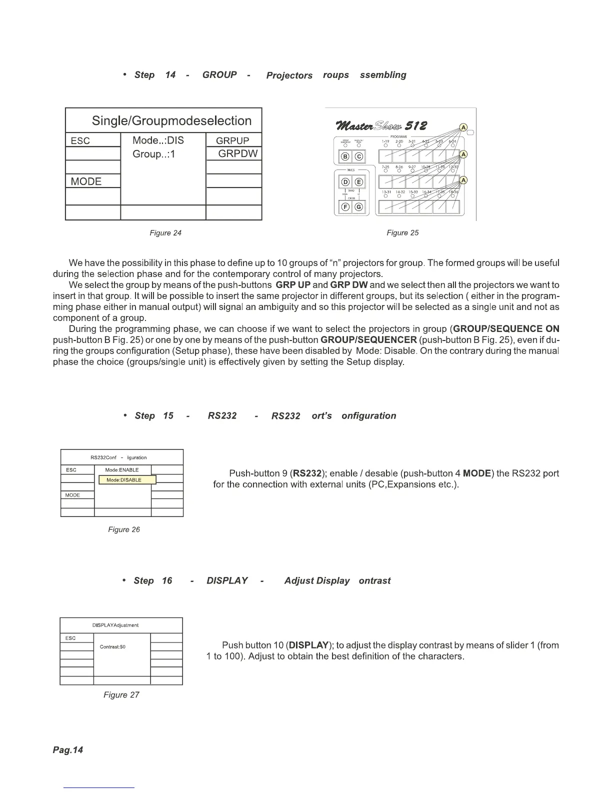 COEF MASTERSHOW 512 - GROUP - Projectors Groups Assembling; RS232 Ports Configuration; DISPLAY - Adjust Display Contrast