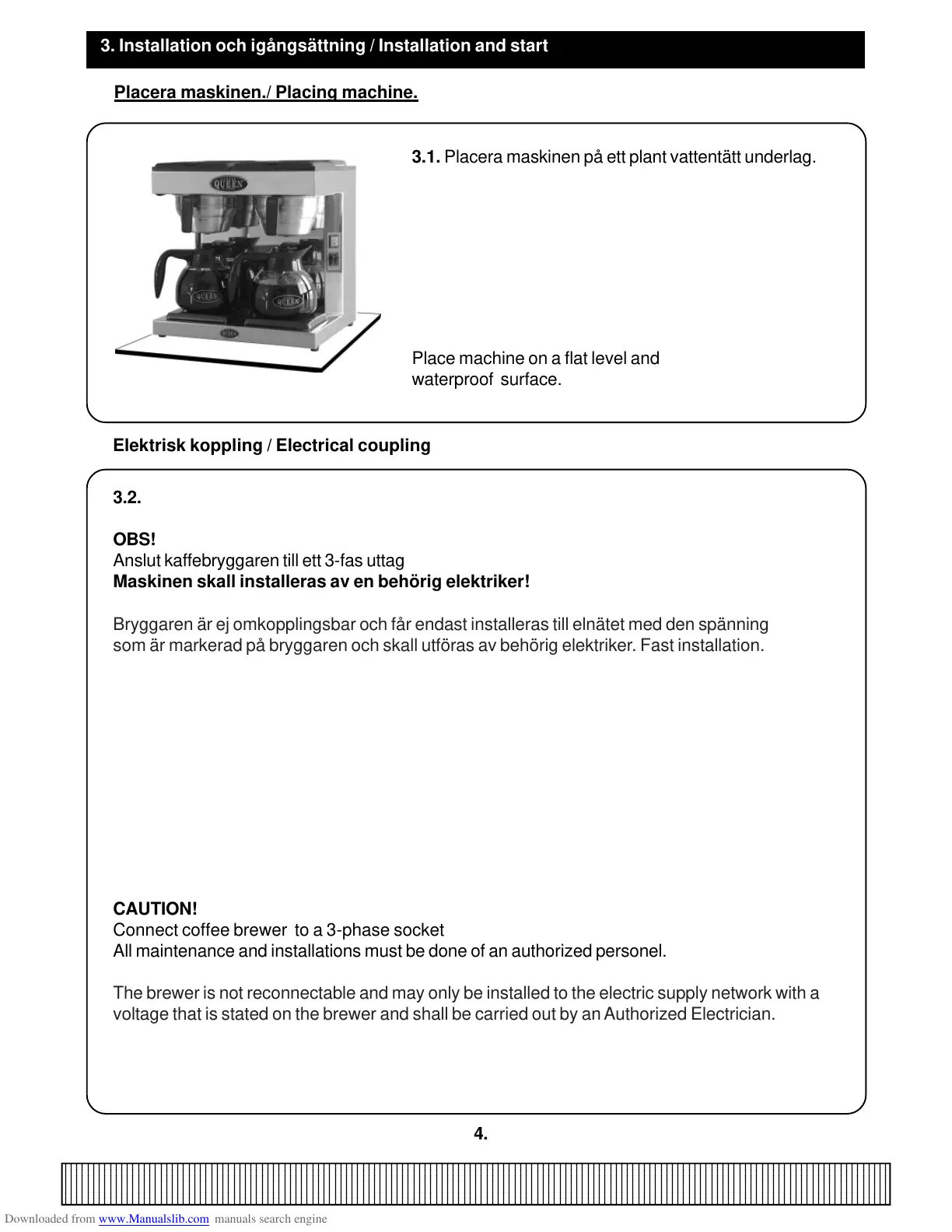 som är markerad på bryggaren och skall utföras av behörig elektriker. Fast installation.