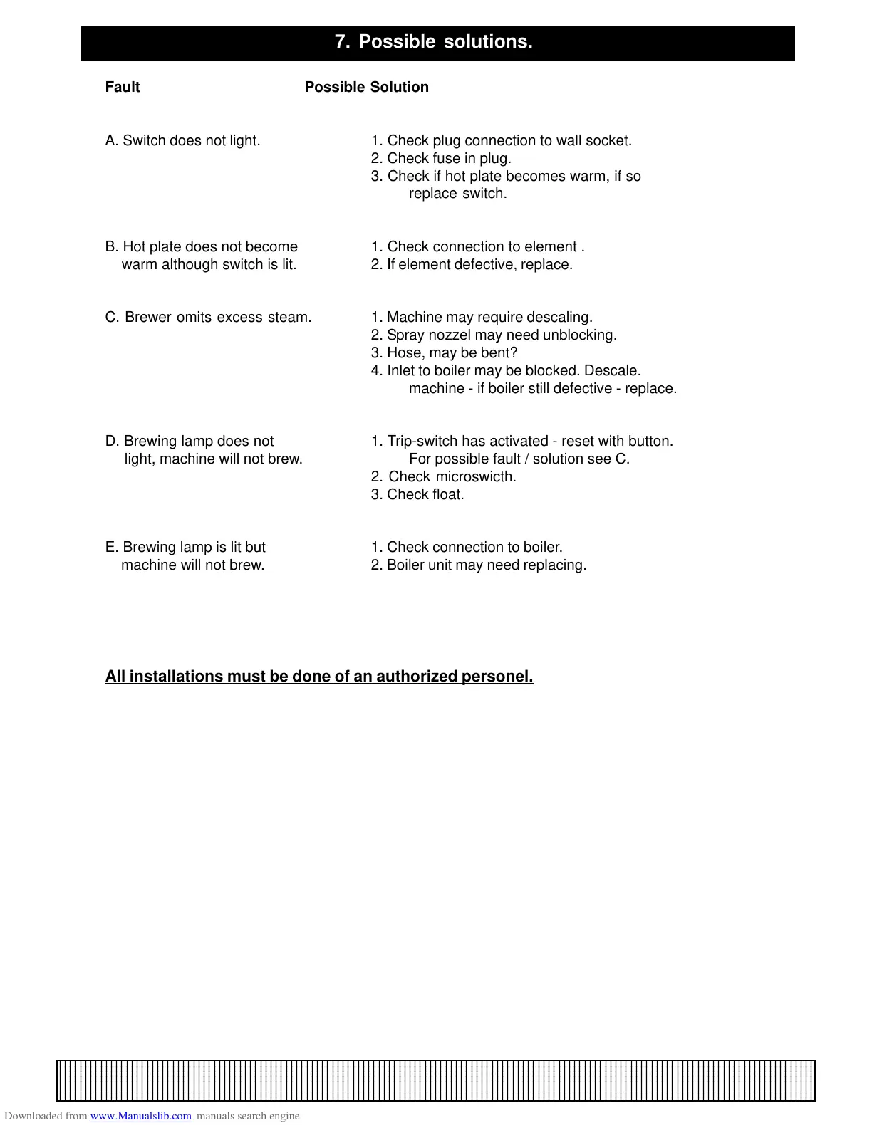 D. Brewing lamp does not 1. Trip-switch has activated - reset with button.