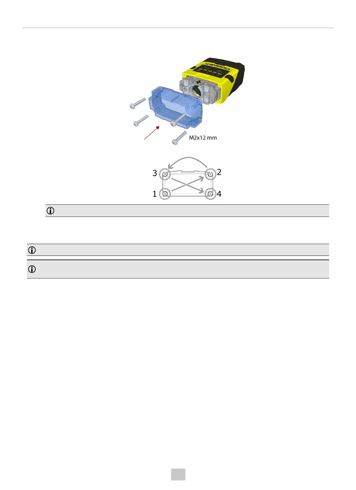 4. Attach the front cover. Observing the tightening sequence below, tighten all four M2x12 mm Phillips Pan head