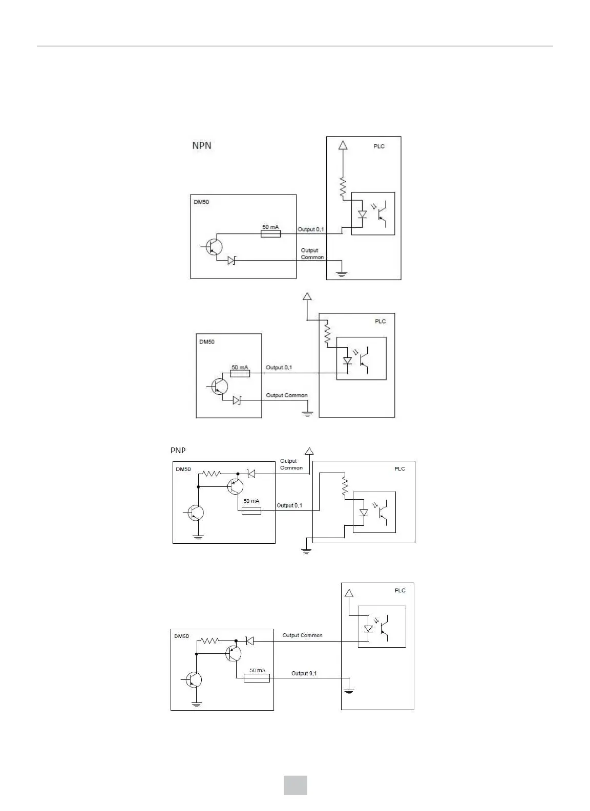 The following figures show external wiring examples for digital input lines for the DataMan 50. The DataMan 60 has the