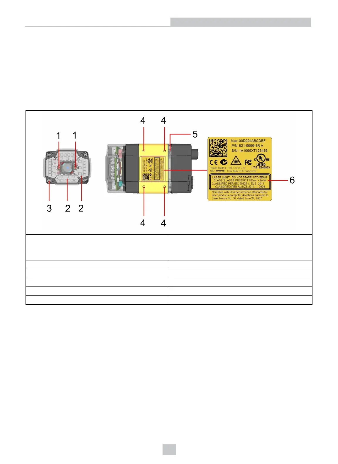 cover, the mounting holes and the laser safety notice on the bottom of the reader.