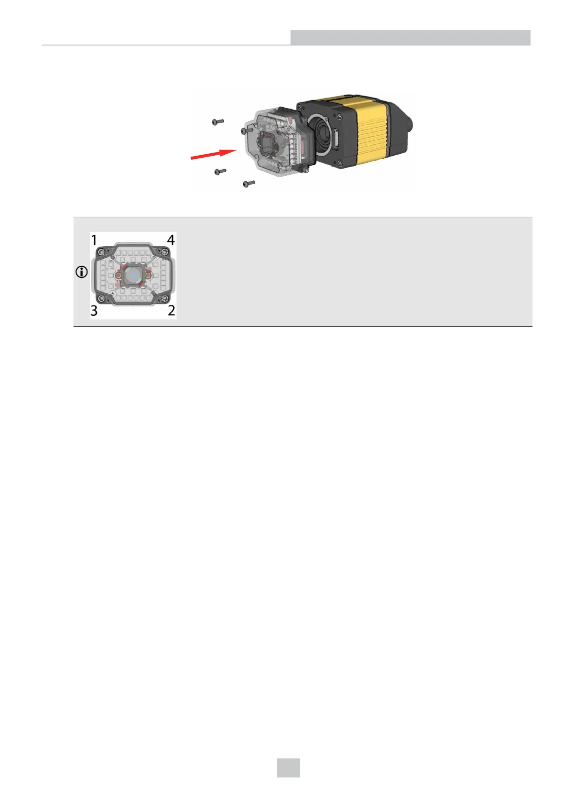 8. Remount the front cover. Observing the tightening sequence below, tighten all four screws to 9 Ncm using a