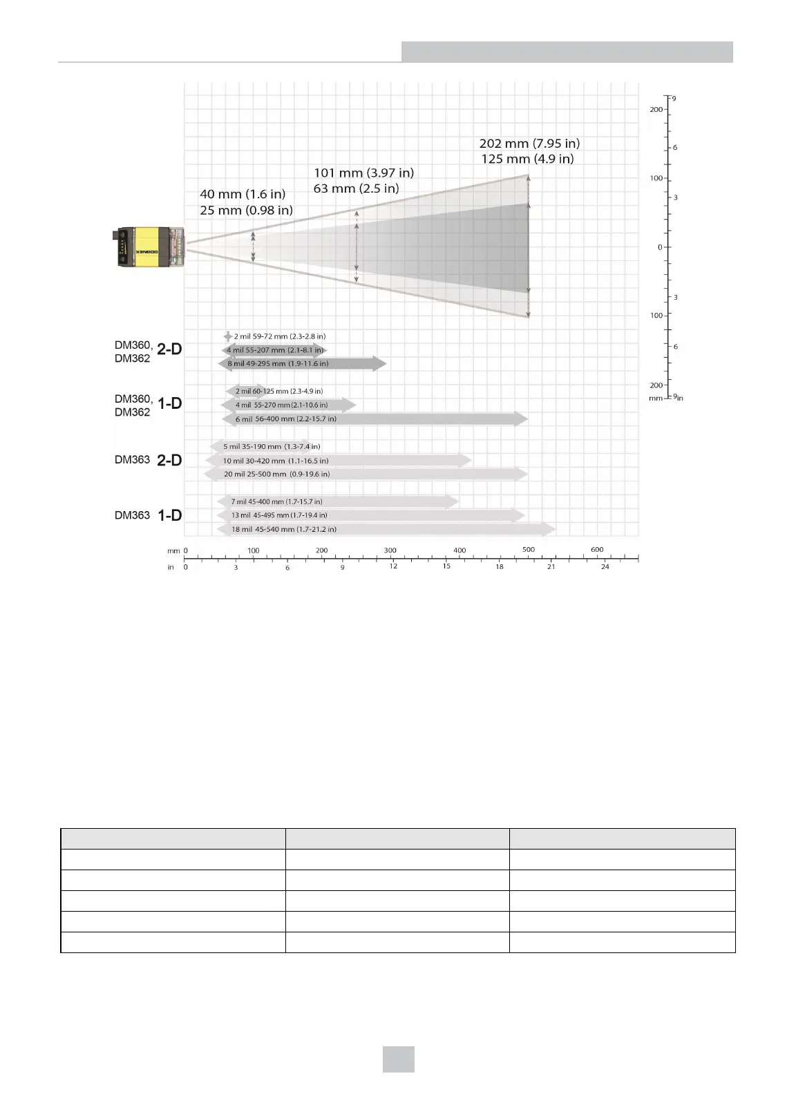 The reading distances for the DM360 and DM362 readers are the same. DM363 features a higher resolution and more
