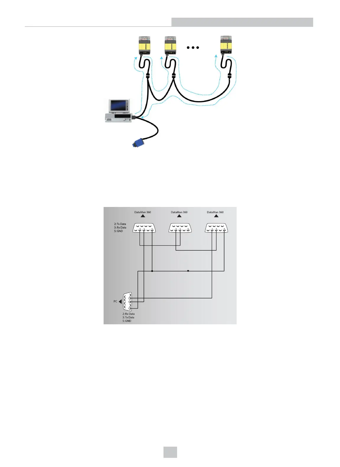 The cable must provide a DB-15 connector for each DataMan 360 and a DB-9 connector for the PC serial port. Each DB-