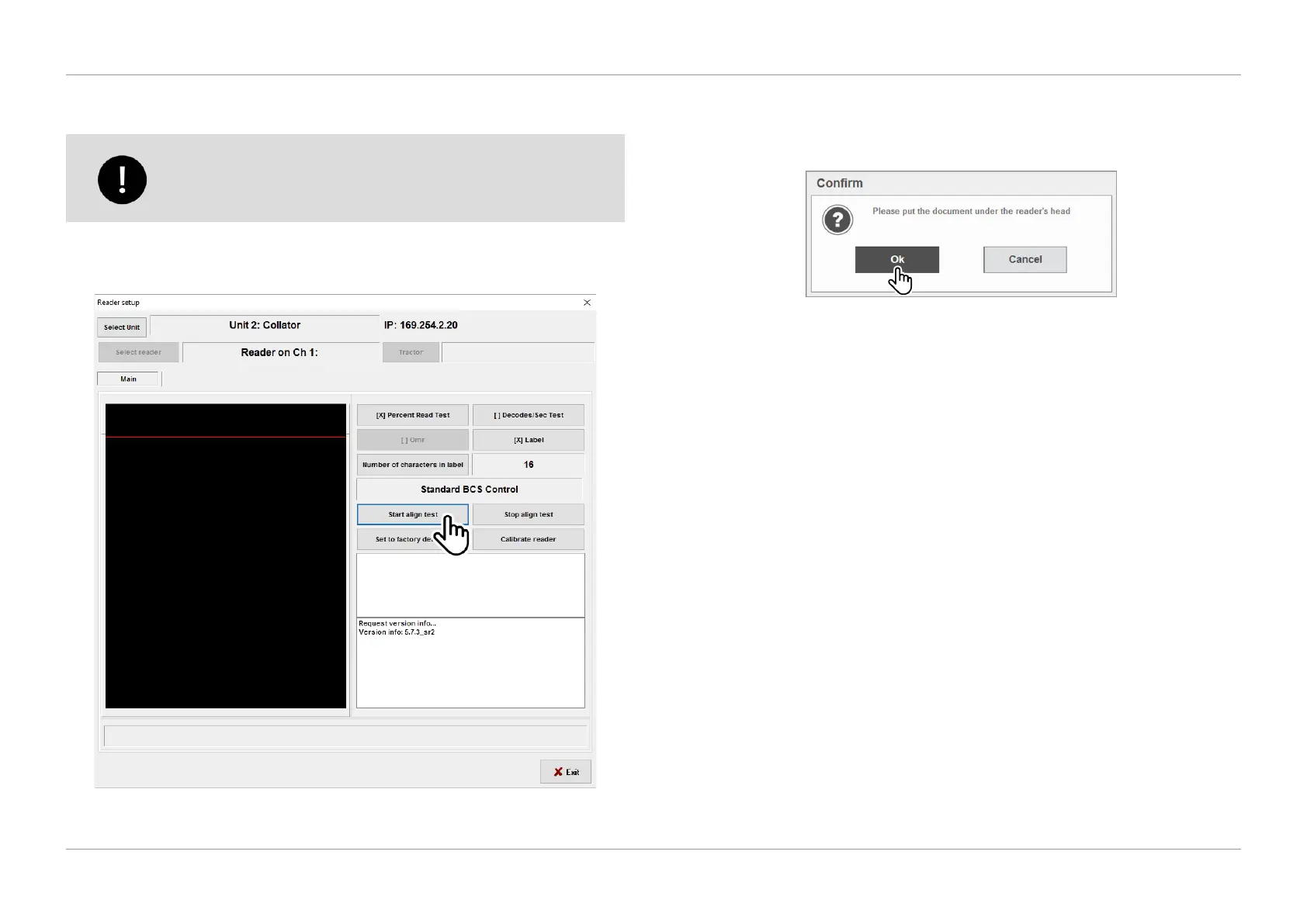 1. To begin reader alignment, select ‘Start align test’ in the Reader Setup screen