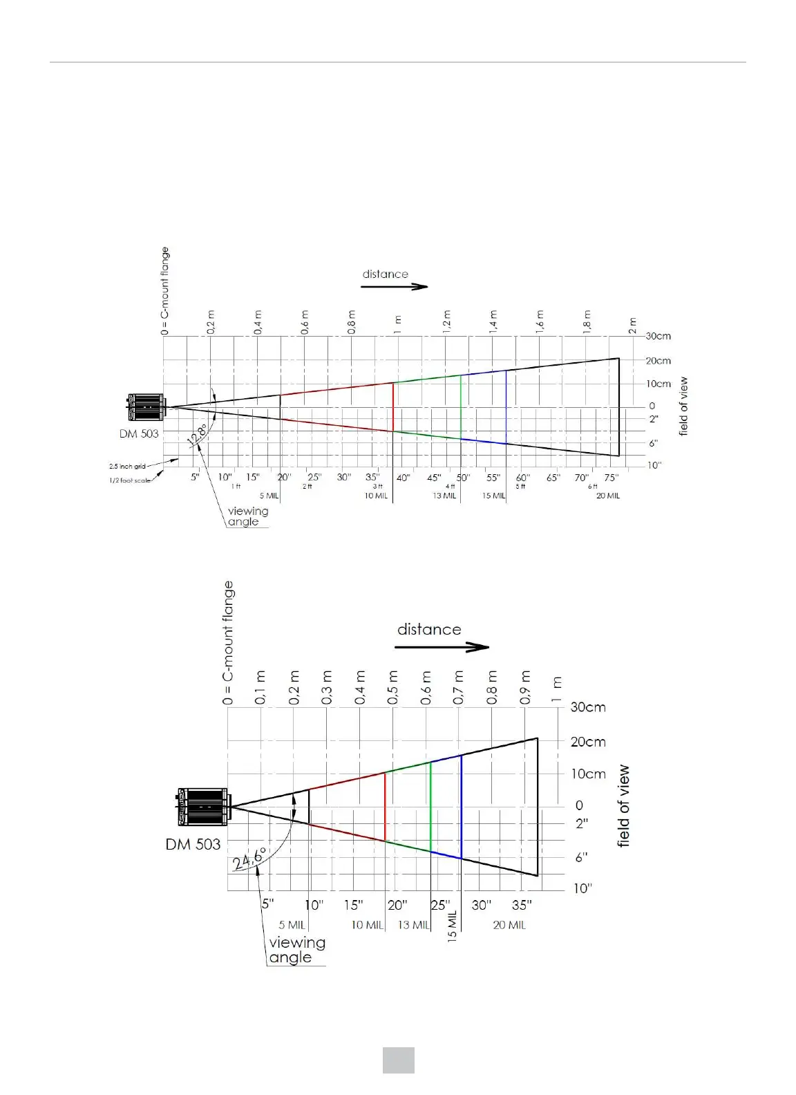 The following scan maps show the reading distance and field of view charts for the various lenses that can be used with