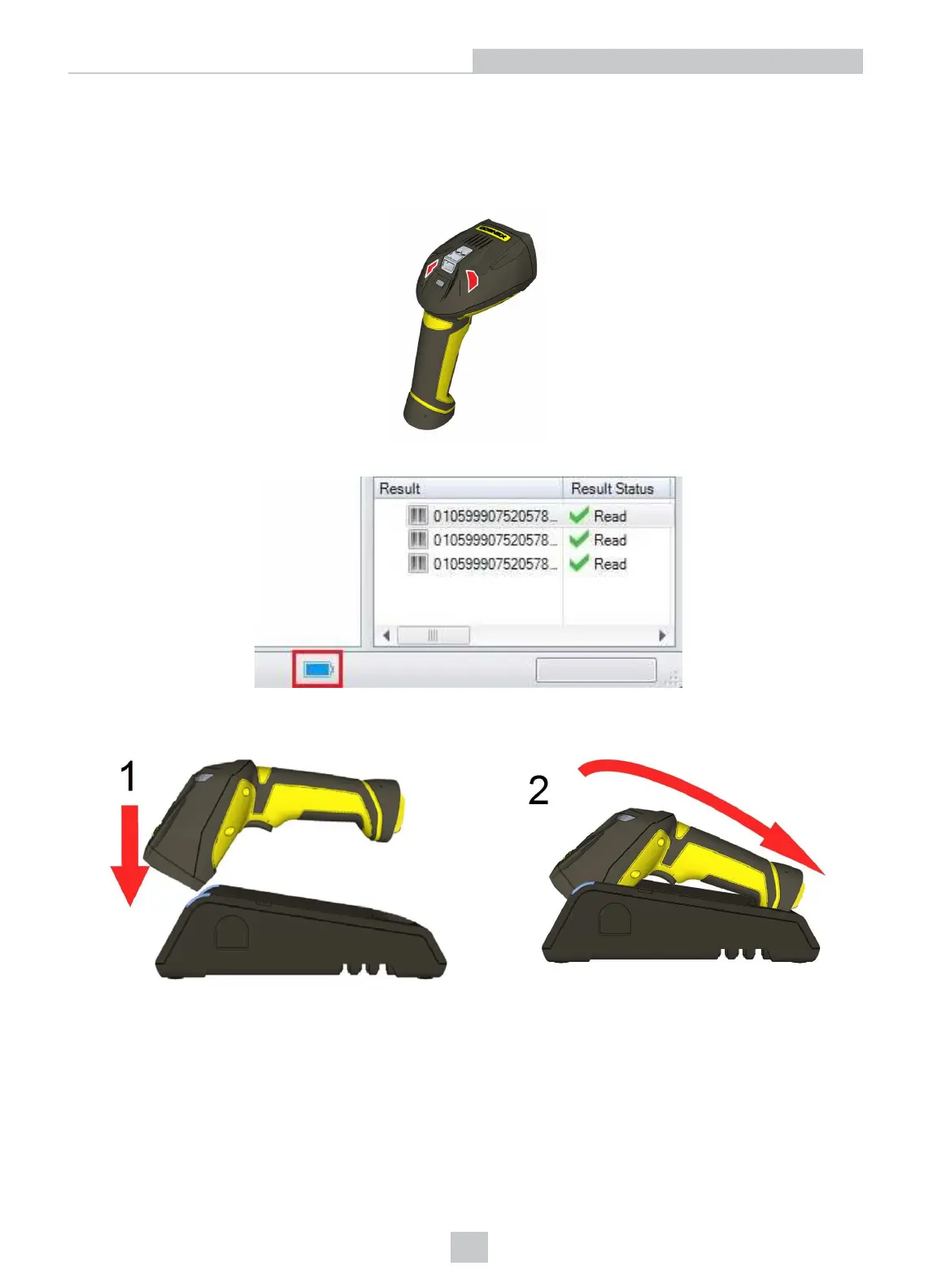 Place the reader on the base station for charging. Make sure that the pins at the end of the handle make contact with the