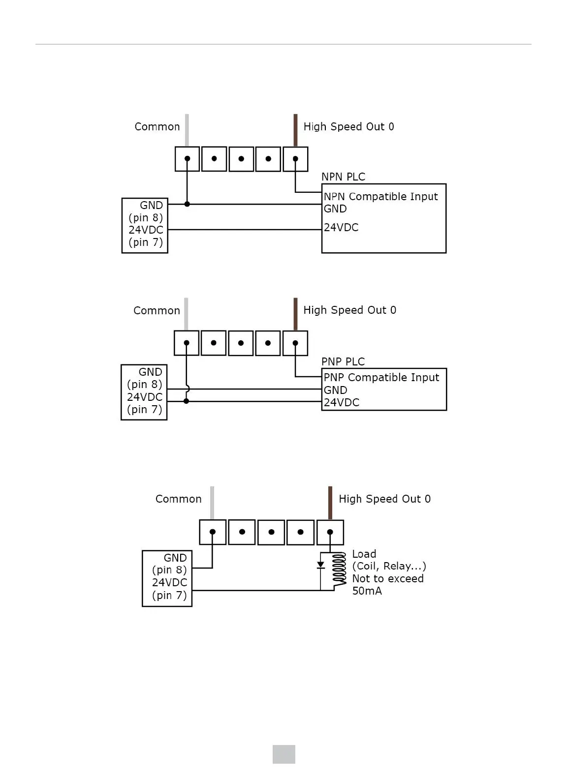 To connect the high-speed outputs to a relay, LED or similar load, connect the negative side of the load to the output and