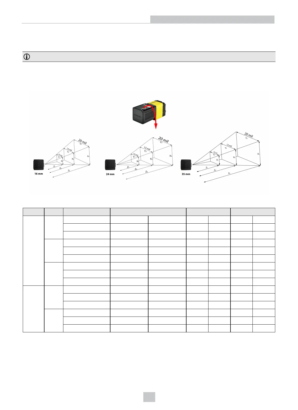 The following field of view projections represent the approximate 1-Axis field of view achievable for 1D and 2D barcodes.