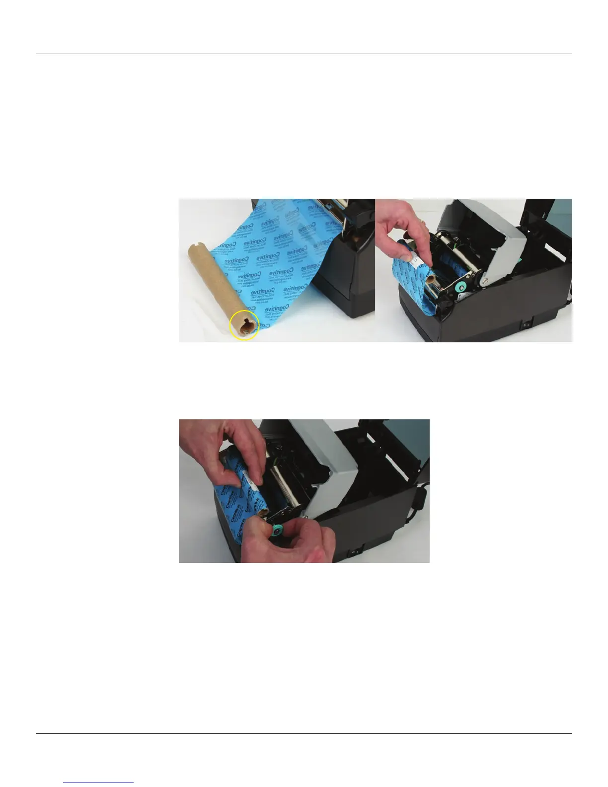 Next, install the ribbon take up roll. Examine the ends of the ribbon take up core and