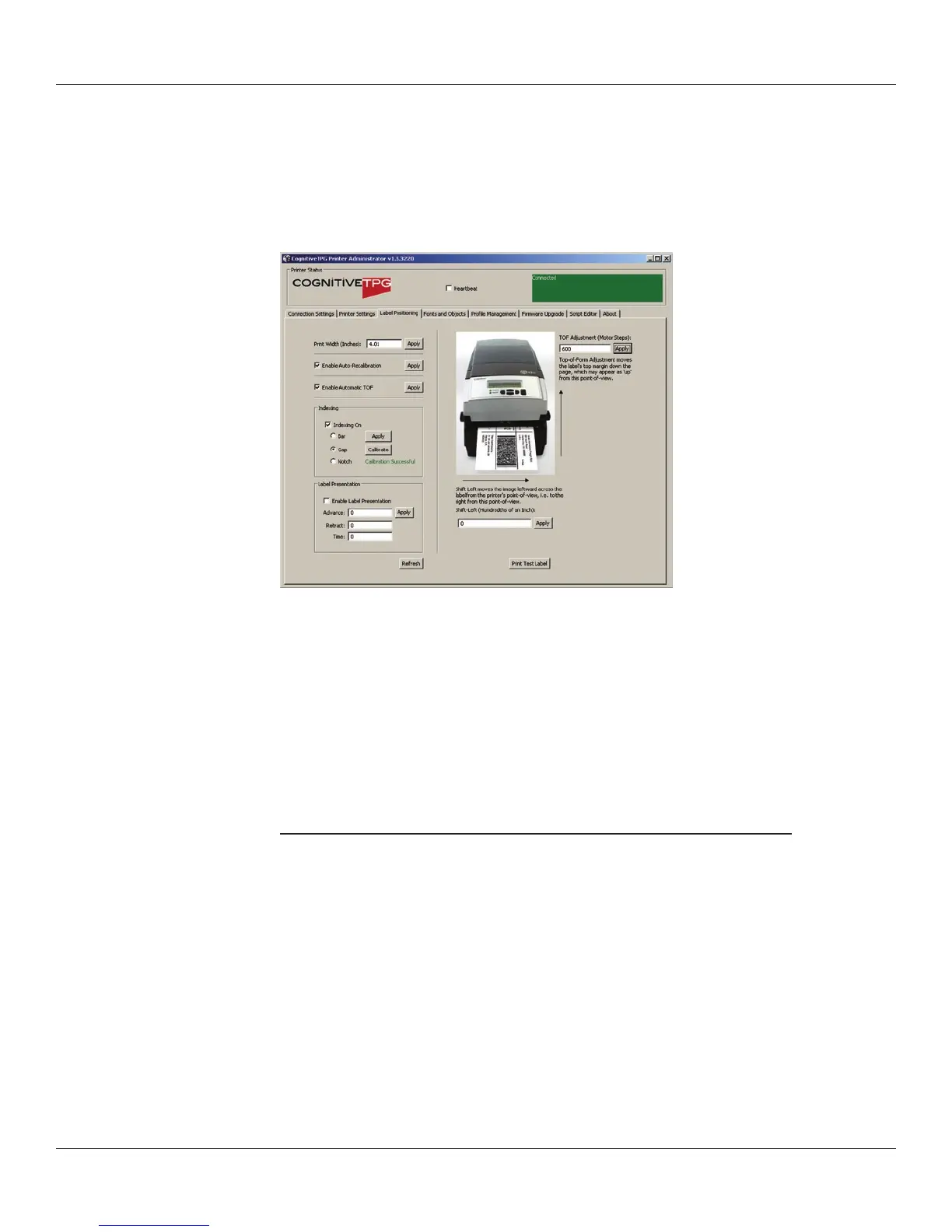 includes setting the width of the media, the type of indexing, top-of-form, shift-left,