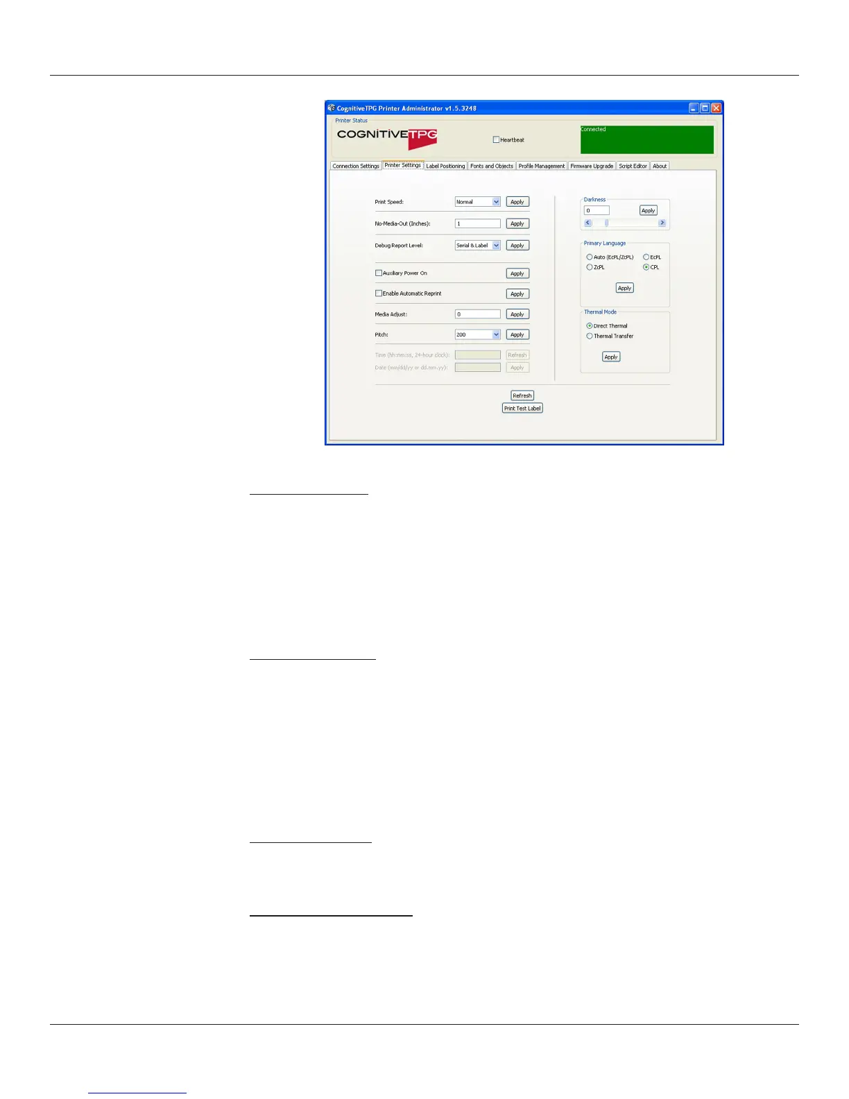 • Serial & Label = Printer sends error report via serial port and prints an error