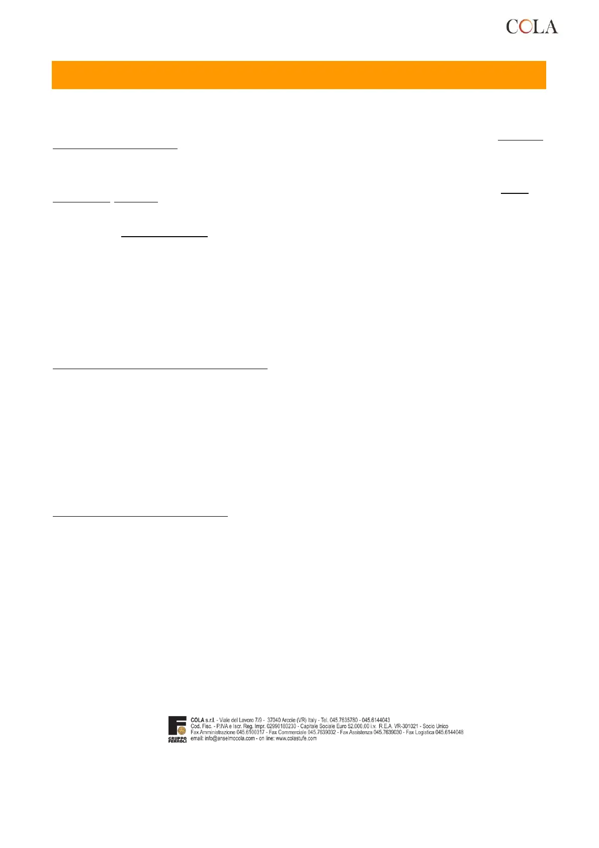 Le condizioni di Garanzia convenzionale sopraelencate sono le uniche offerte dalla COLA Srl; nessuna terza parte è autorizzata a modificare i termini della