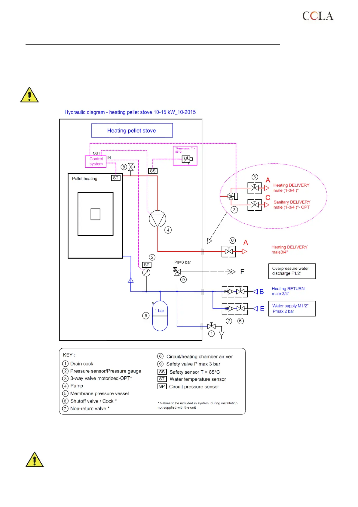 For the connection to the DHW circuit it is necessary to install a monostable 3-way valve outside the stove whereas