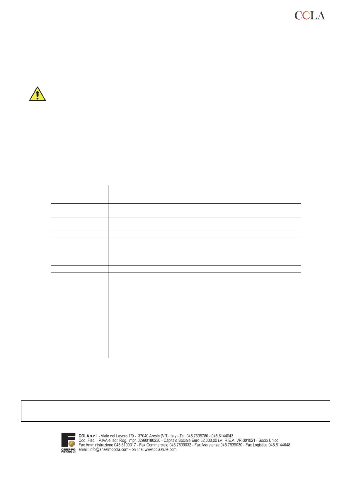 La société COLA s.r.l. se réserve d'apporter des modifications techniques ou esthétiques à ses produits