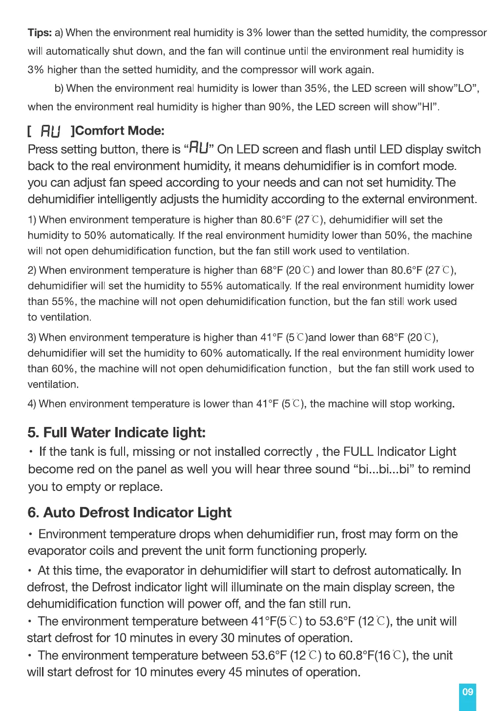 1) When environment temperature is higher than 80.60F (27 C), dehumidifier will set the