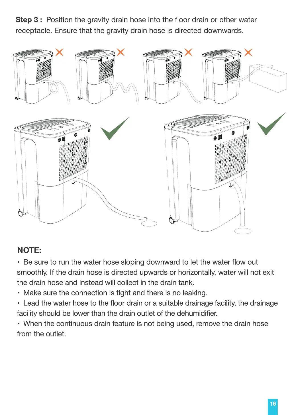 receptacle. Ensure that the gravity drain hose is directed downwards.