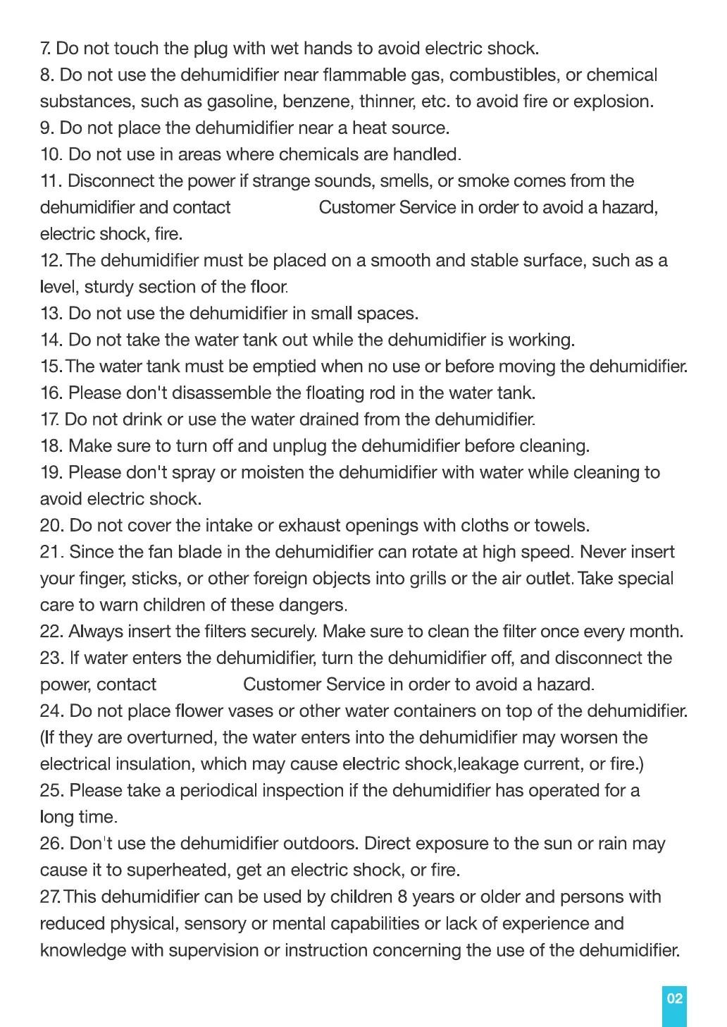 19. Please don't spray or moisten the dehumidifier with water while cleaning to