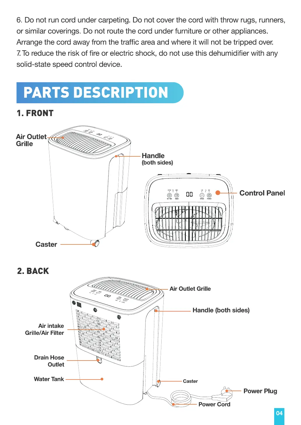 6. Do not run cord under carpeting. Do not cover the cord with throw rugs, runners,