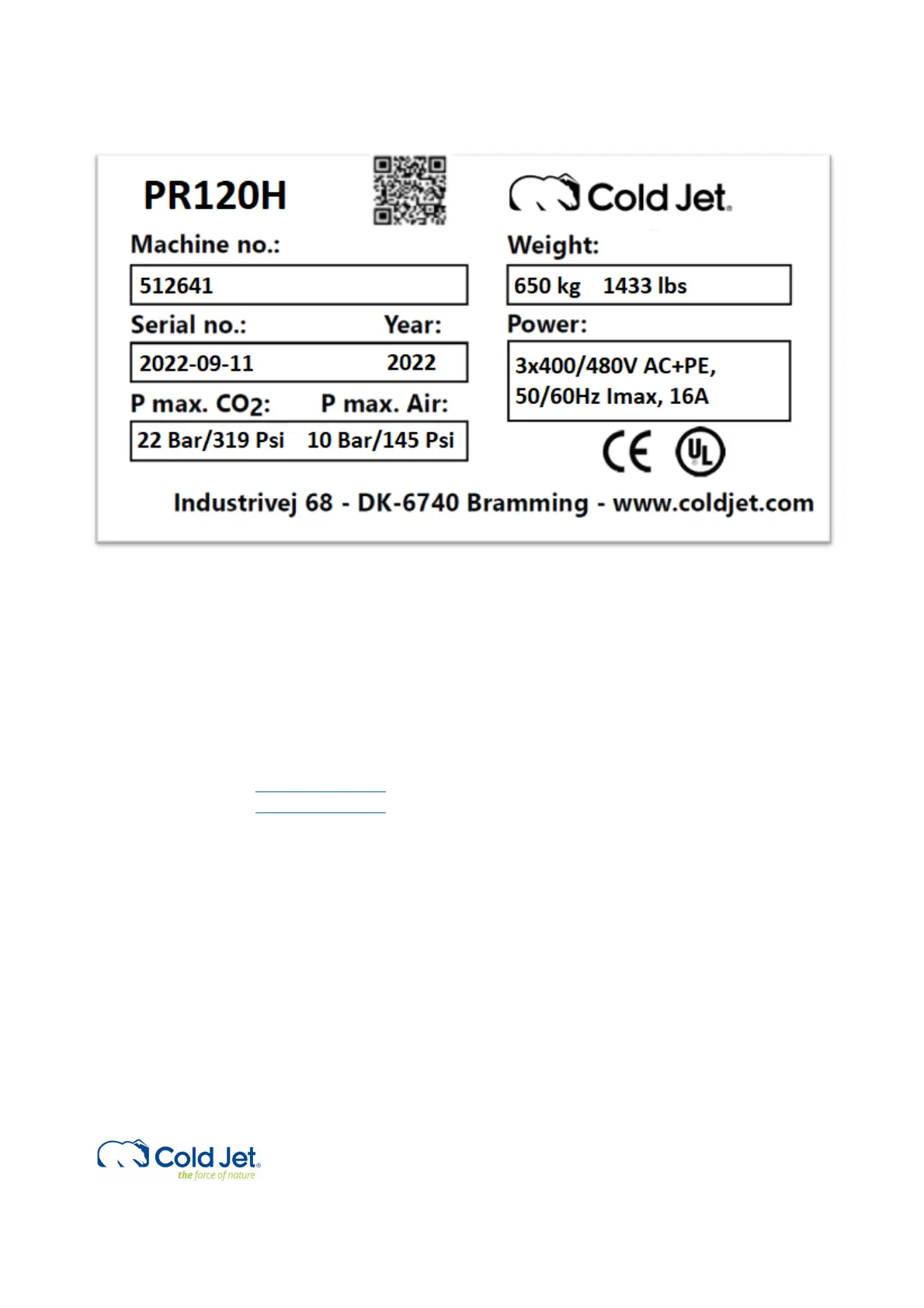 Cold Jet PR120H - System Identification; Supplier Responsible for the Equipment