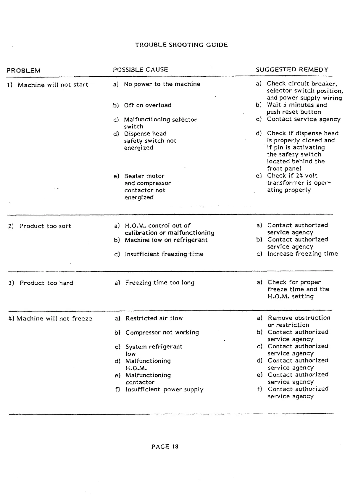 Machine will not freeze a) Restricted air flow